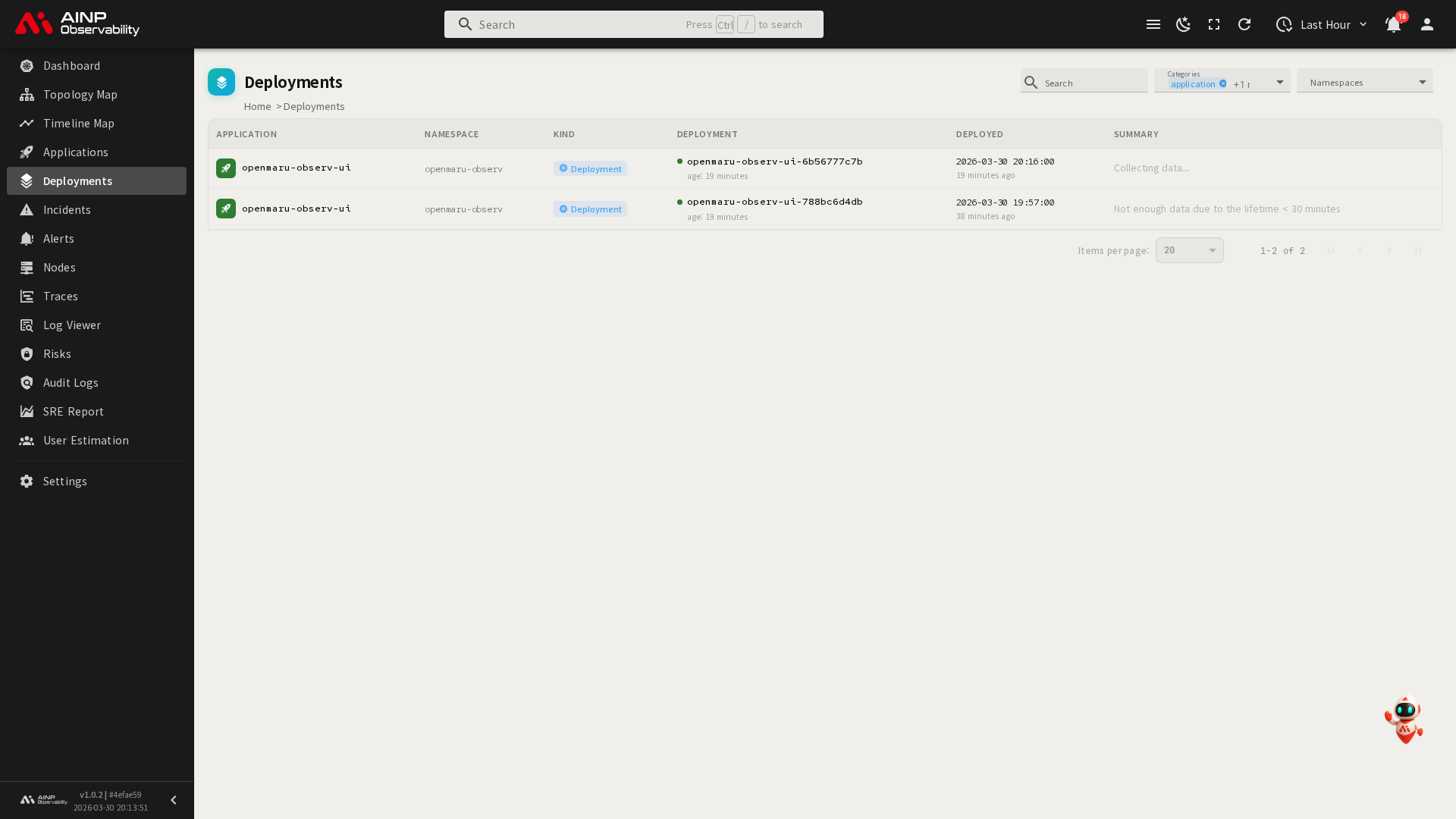 - 애플리케이션 컬럼: 정상 배포에는 로켓 아이콘이 녹색으로, 경고 또는 심각 상태에서는 알림 아이콘이 노란색 또는 빨간색으로 표시됩니다. 심각 상태에서는 아이콘이 깜빡이므로 시각적으로 빠르게 인지할 수 있습니다.