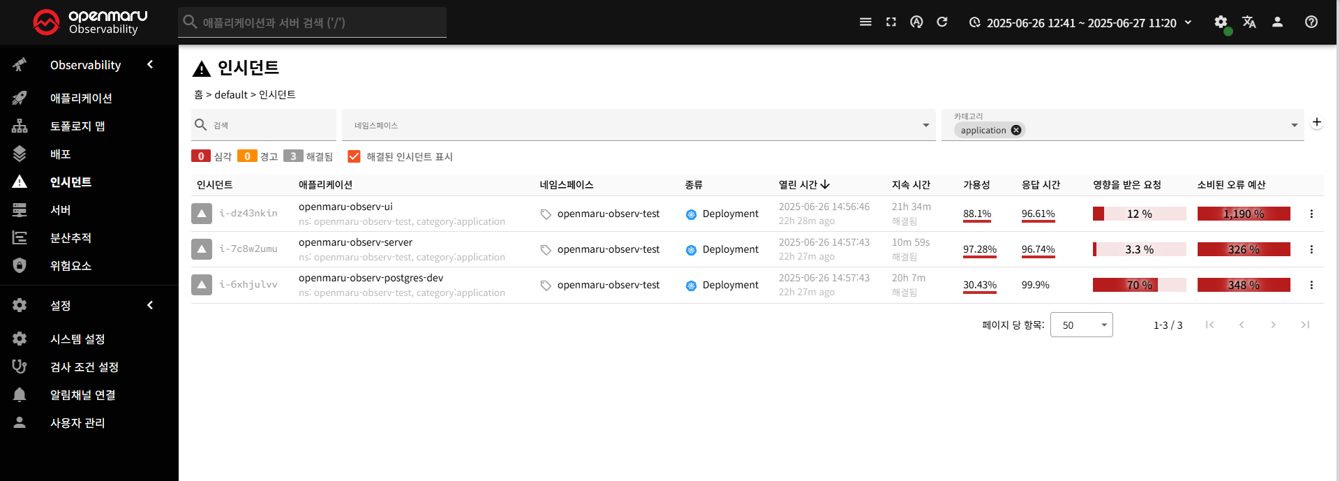 이 화면에서는 프로젝트 내 모든 애플리케이션의 SLO 위반 상황을 실시간으로 모니터링하고, 인시던트의 상세 정보를 확인할 수 있습니다.