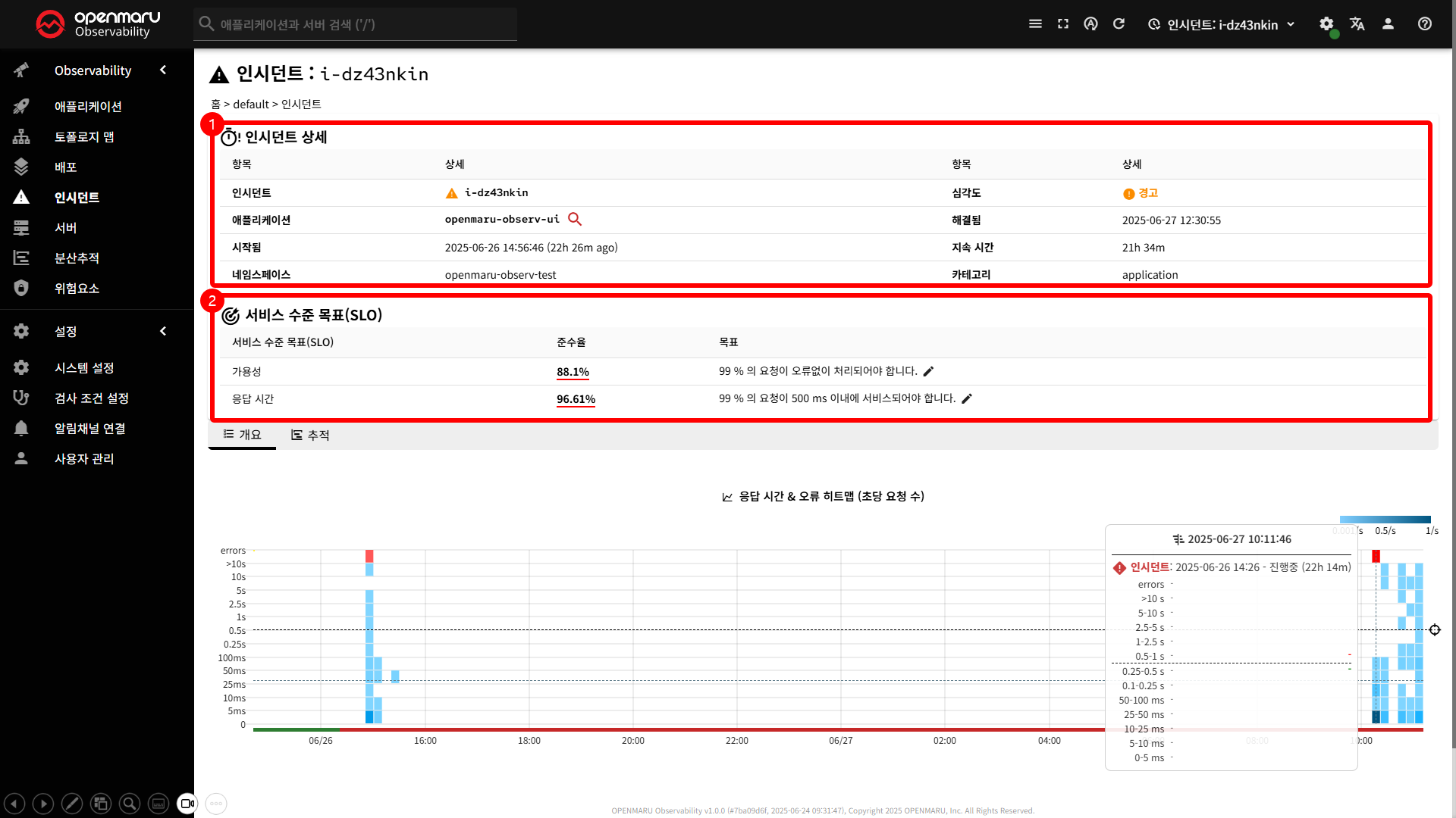 - 가용성과 응답시간에 대한 목표(임계값 설정 정보)와 현재 준수율을 통해서 인시던트가 발생한 원인을 파악할 수 있습니다.