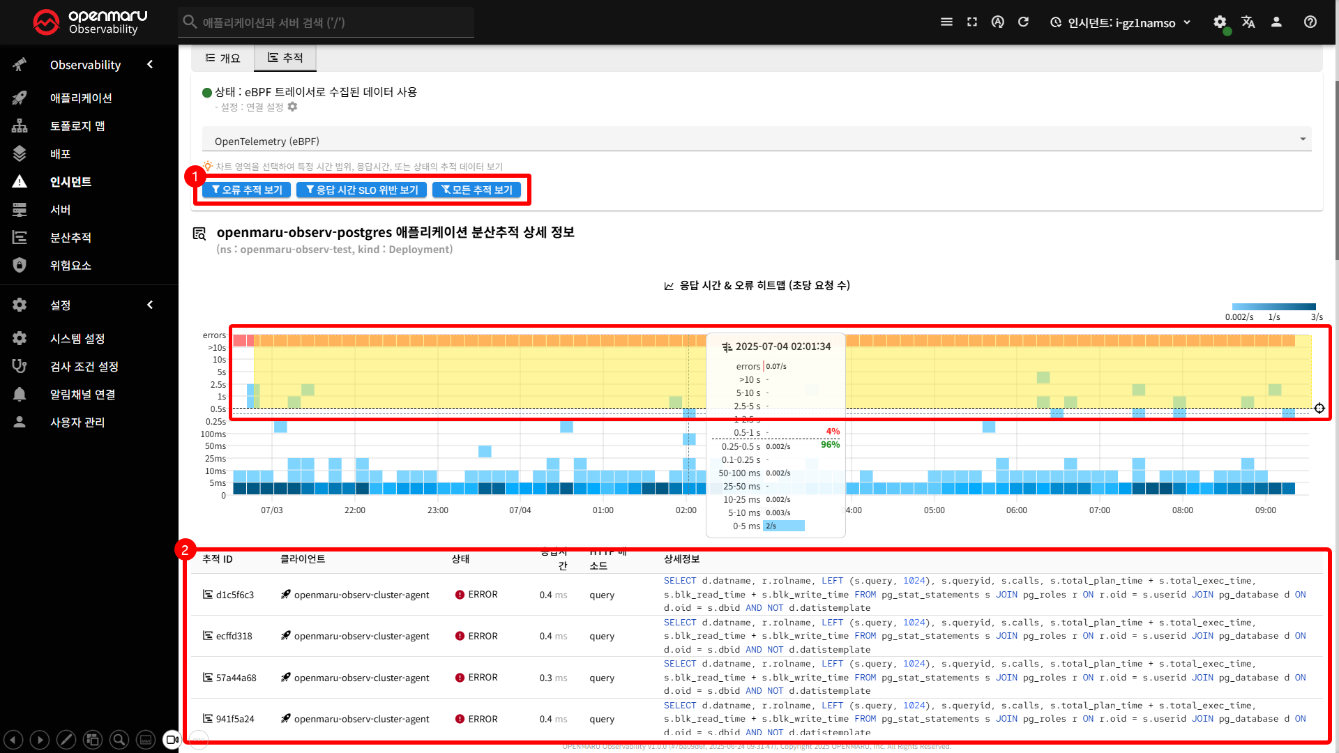 오류 추적 보기: error 가 발생한 요청을 확인하며 히트맵에 해당 부분을 노란색 영역으로 나타냄응답 시간 SLO 위반 보기: SLO 가 발생한 요청을 확인하며 히트맵에 해당 부분을 노란색 영역으로 나타냄모든 추적 보기: 필터를 풀고 모든 요청을 확인합니다.