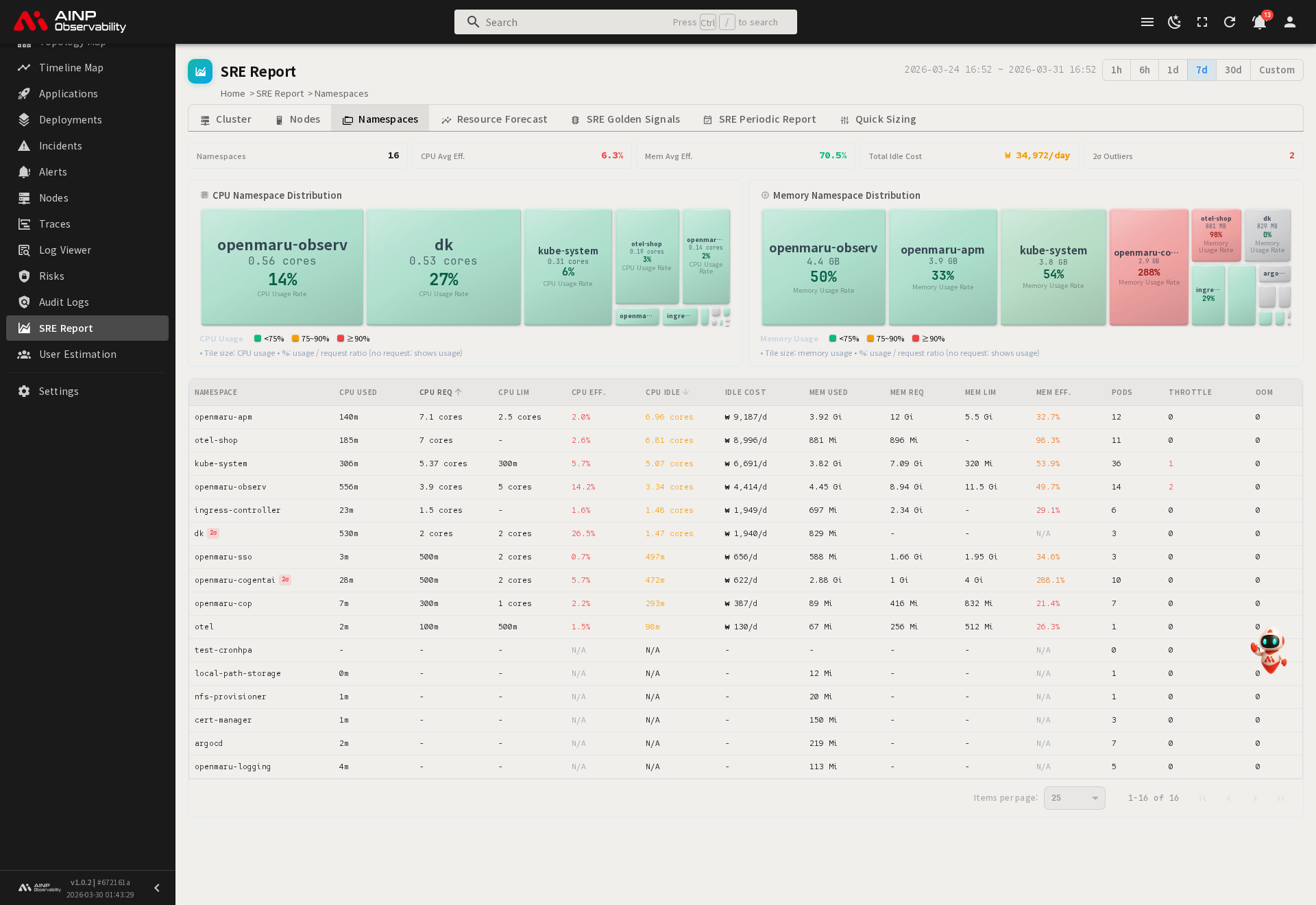 | 네임스페이스 | 네임스페이스별 자원 분포, 효율성, 유휴 비용 |