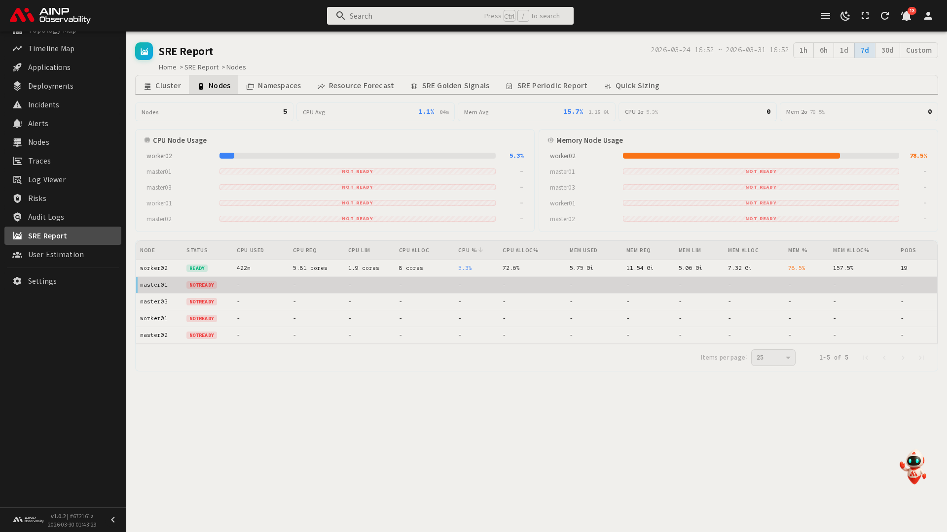 SRE 보고서는 Google SRE 방법론에 기반한 종합 보고서 화면입니다. 클러스터, 서버(노드), 네임스페이스 단위의 자원 사용 현황을 파악하고, 미래 용량을 예측하며, SLO(Service Level Objective) 준수 상태를 모니터링할 수 있습니다. 또한 자원의 과다/과소 프로비저닝을 분석하여 비용 최적화를 위한 적정 사이징 추천을 제공합니다.