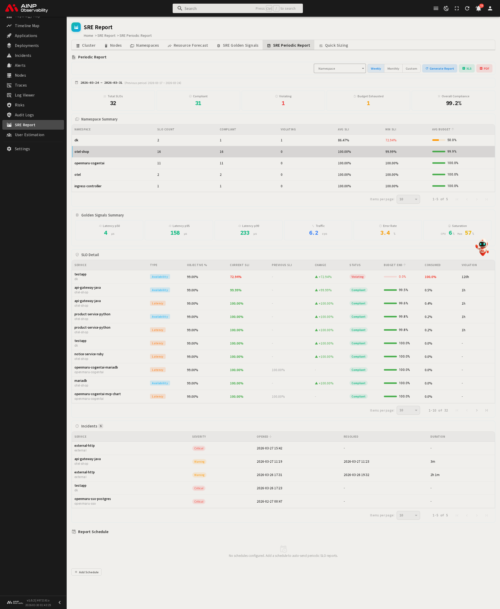 네임스페이스 요약네임스페이스별 평균 SLI, 최저 SLI, 평균 버짓 잔량