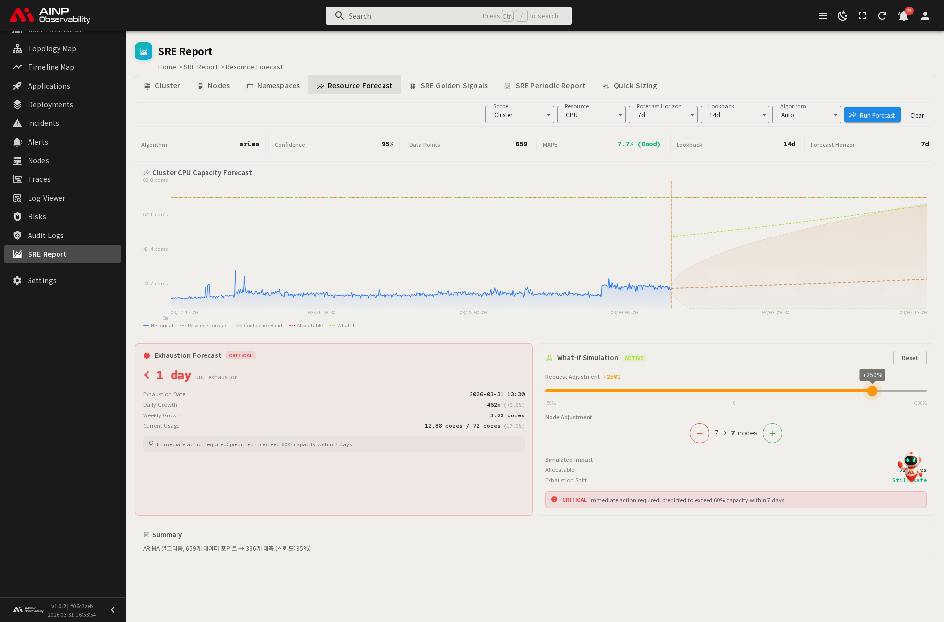 과거 자원 사용 추이를 기반으로 미래 사용량을 예측하고, 자원 고갈 시점을 분석합니다.