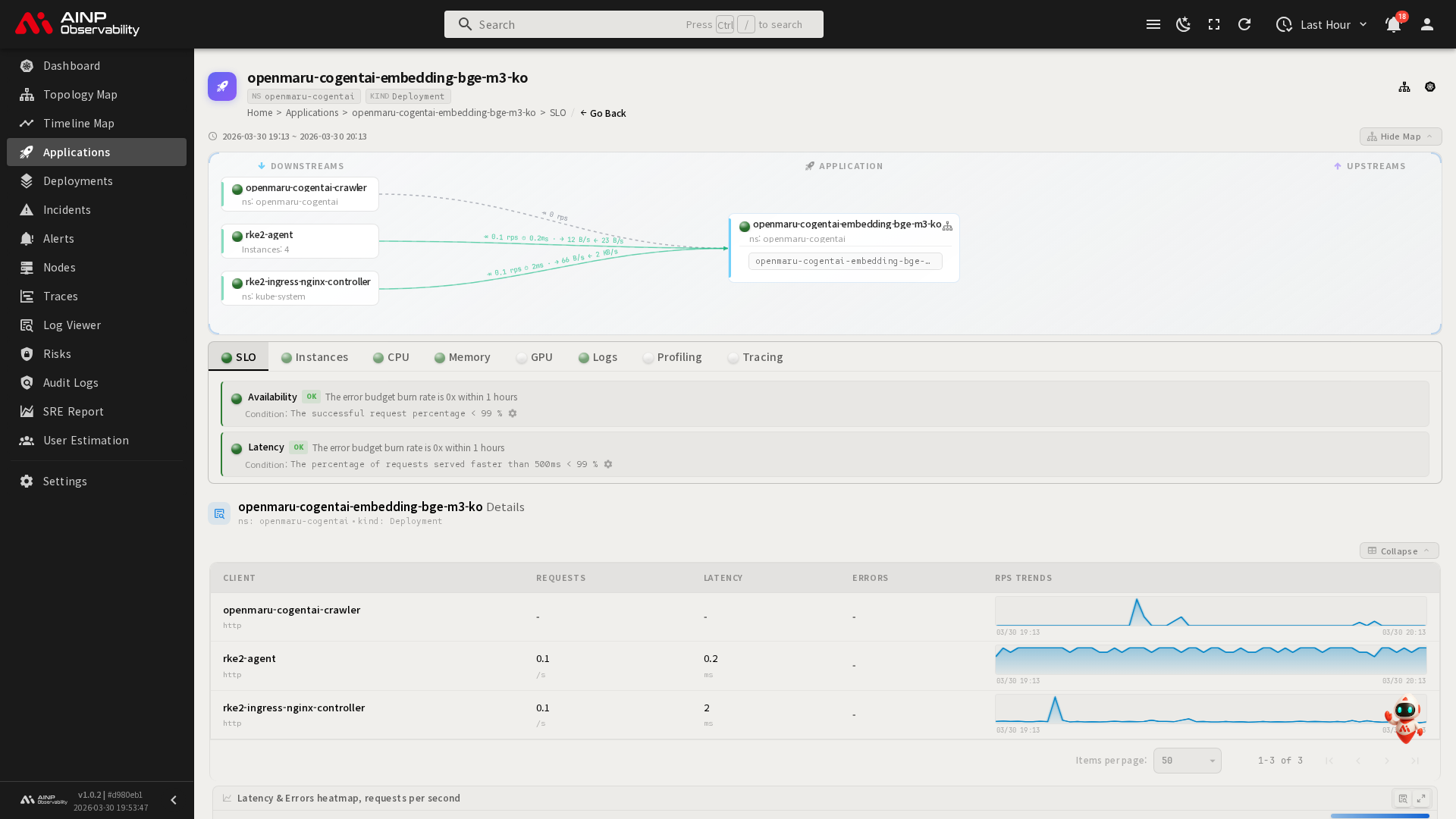 위험요소 테이블의 애플리케이션 컬럼에 있는 이름을 클릭하면 해당 애플리케이션의 상세 페이지로 이동합니다. 상세 페이지에서 해당 애플리케이션의 메트릭, 로그 등을 확인하여 위험요소의 영향 범위를 파악할 수 있습니다.