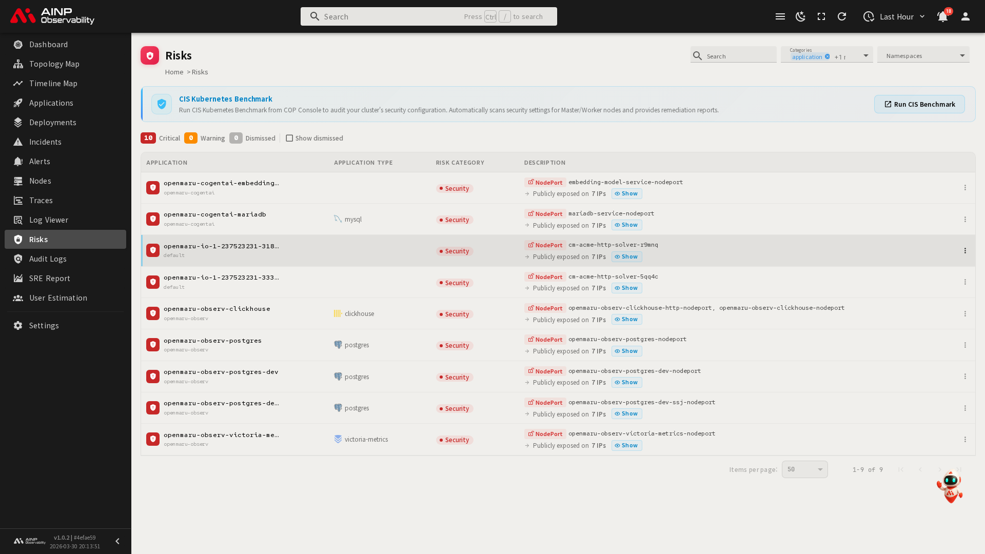 위험요소 화면에서는 Kubernetes 클러스터에서 감지된 보안 위험요소를 확인하고 관리할 수 있습니다. NodePort나 LoadBalancer를 통해 공개적으로 노출된 데이터베이스, 안전하지 않은 서비스 노출 등 보안상 주의가 필요한 항목을 자동으로 탐지하여 목록으로 제공합니다.