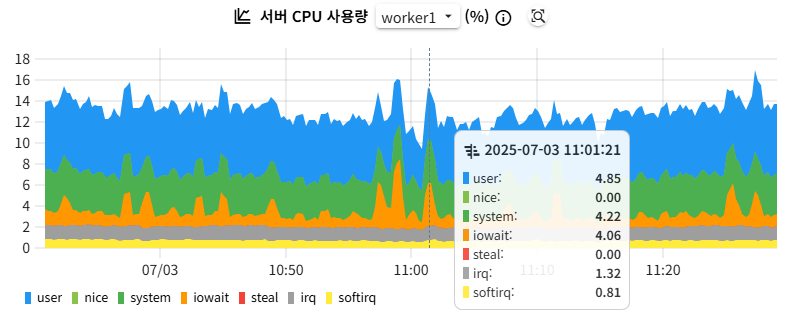 각 CPU 사용 모드별 CPU 사용률을 백분율로 표시