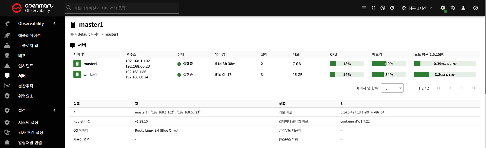 서버정보, 커널버전, kubelet 버전, 컨테이너 런타임버전, OS, 클라우드 제공자, 가용성영역, 인스턴스 유형 정보를 표시합니다.