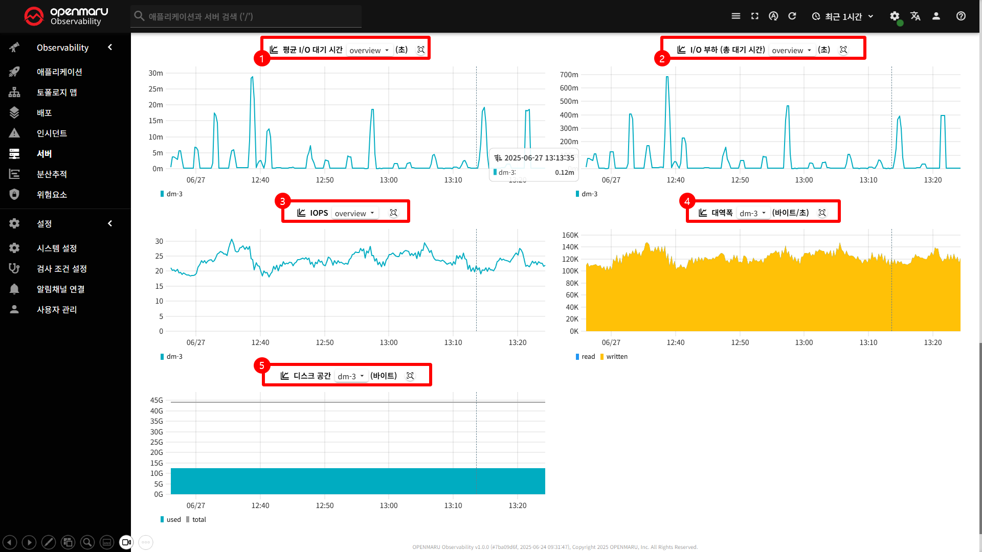 평균 I/O 대기시간 차트는 서버의 디스크 I/O 작업이 완료되는 데 걸리는 평균 시간을 측정하여 표시합니다.