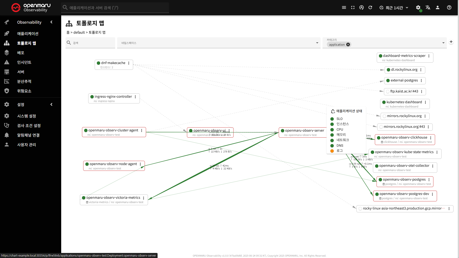 토폴로지 맵은 오픈마루 Observability의 핵심 기능으로, 마이크로서비스 아키텍처에서 서비스 간의 의존성과 호출 관계를 시각적으로 표현합니다.